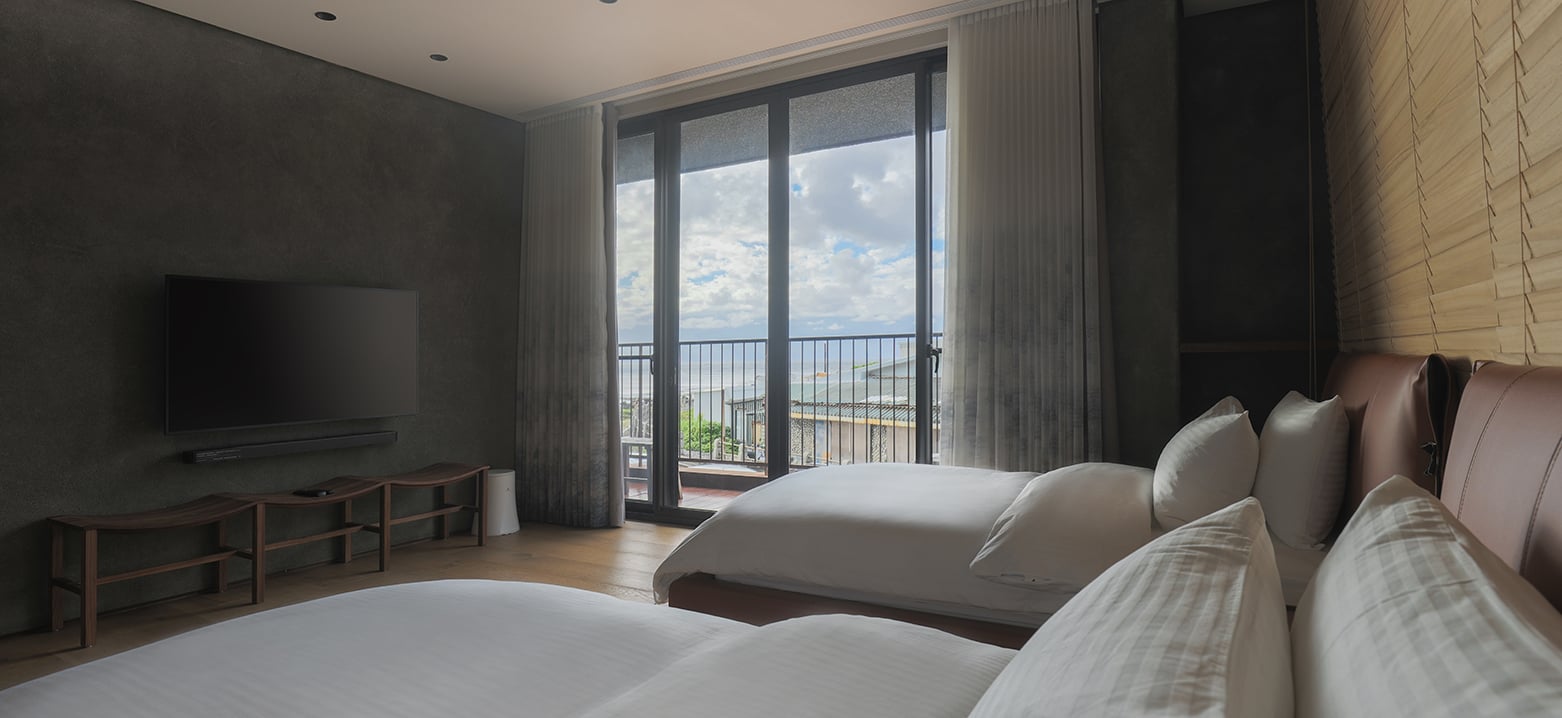 雙床位雅緻客房,木製簡約設計櫥櫃,衛浴空間寬敞明亮,附設典雅浴缸,享受專屬海島的悠閒時光。