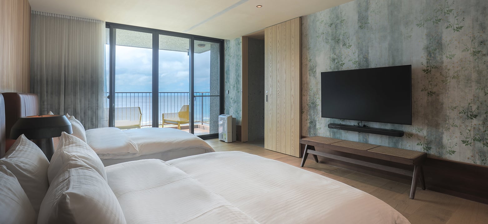 別緻精選雙大床,牆面彩繪工巧,空間寬敞,大面落地窗欣賞優美海景,享受靜謐閒適的海島時光。